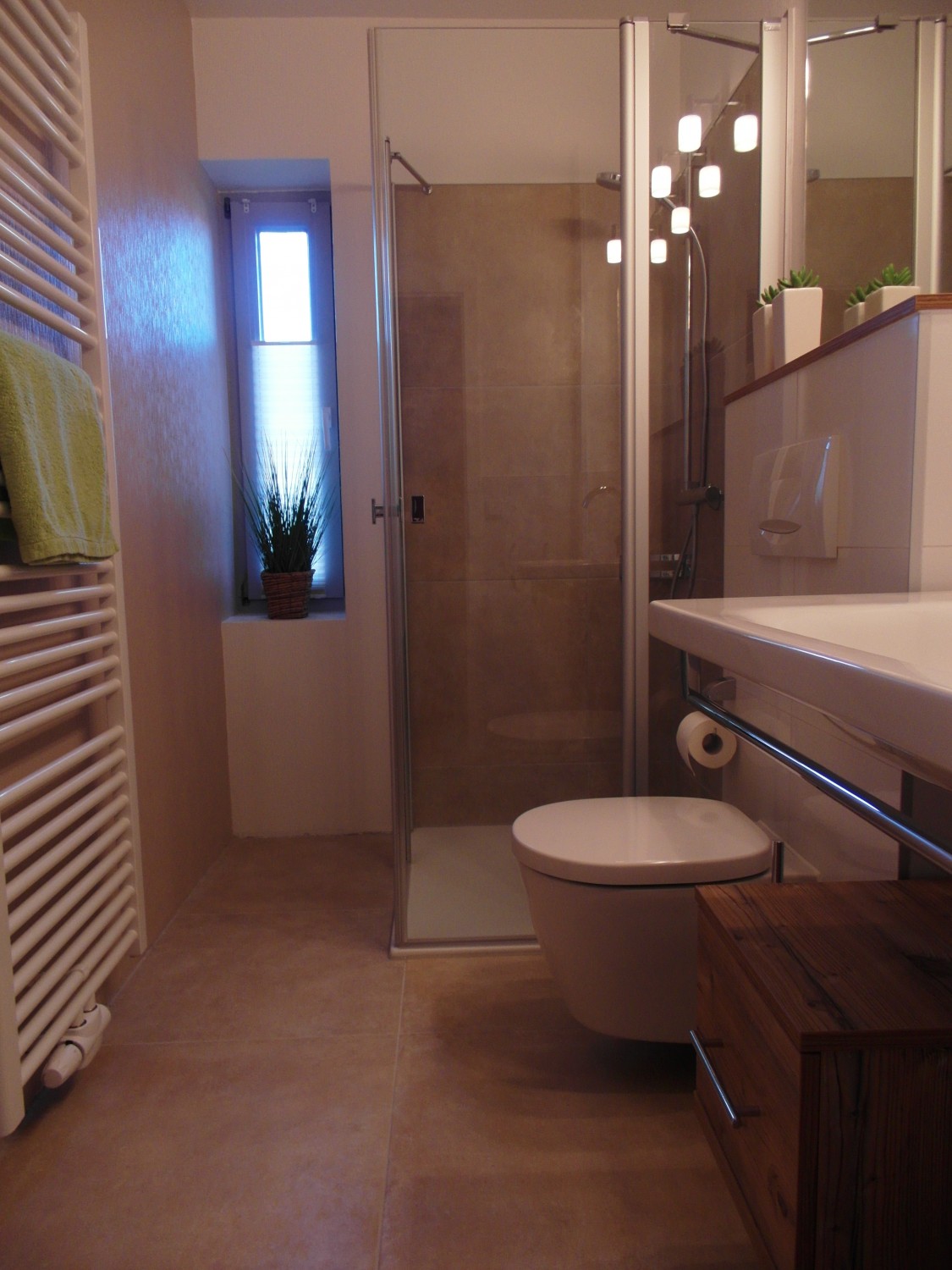 - Spiegelschrank, kleiner Ablageschrank, Badhocker, Haarfön, Handgriff in der Dusche
